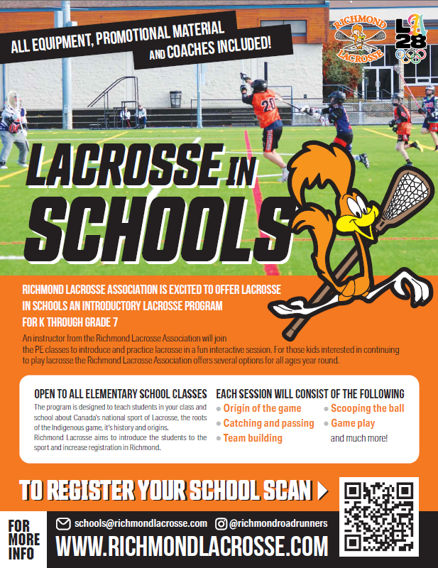 Richmond Lacrosse Association is excited to offer - Lacrosse in Schools - an introductory Lacrosse program for K through Grade 7.